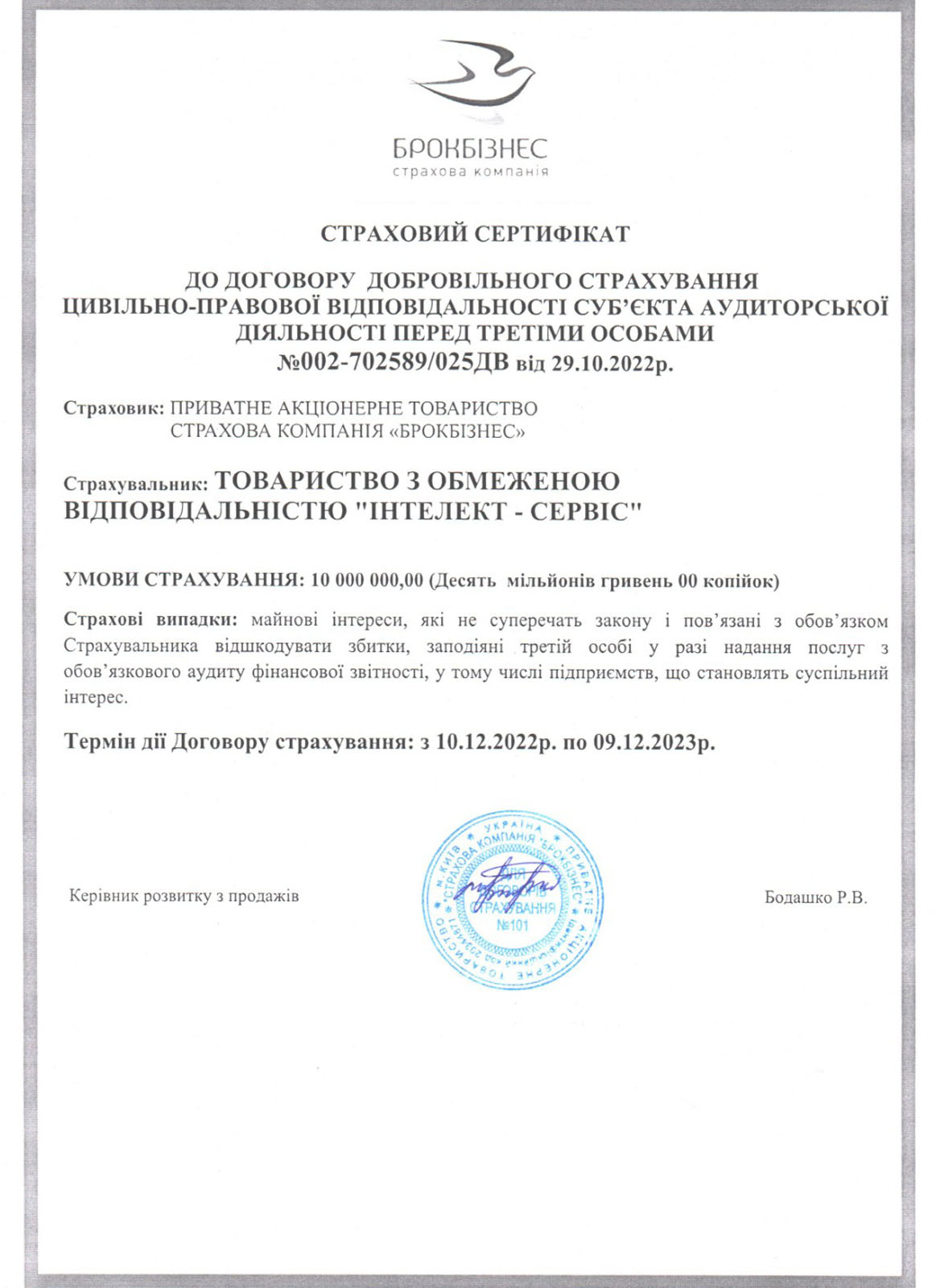 Професійна відповідальність ТОВ «ІНТЕЛЕКТ-СЕРВІС» застрахована в ПРИВАТНОМУ АКЦІОНЕРНОМУ ТОВАРИСТВІ “СТРАХОВА КОМПАНІЯ “БРОКБІЗНЕС” (Договір №002-702589/025ДВ від 29.10.2022 добровільного страхування цивільно-правової відповідальності суб’єкта аудиторської діяльності перед третіми особами.) предметом якого є майнові інтереси, пов’язані з відшкодуванням страхувальником заподіяної ним в процесі своєї професійної діяльності шкоди третім особам, з страховою сумою 10 000 000 гривень.