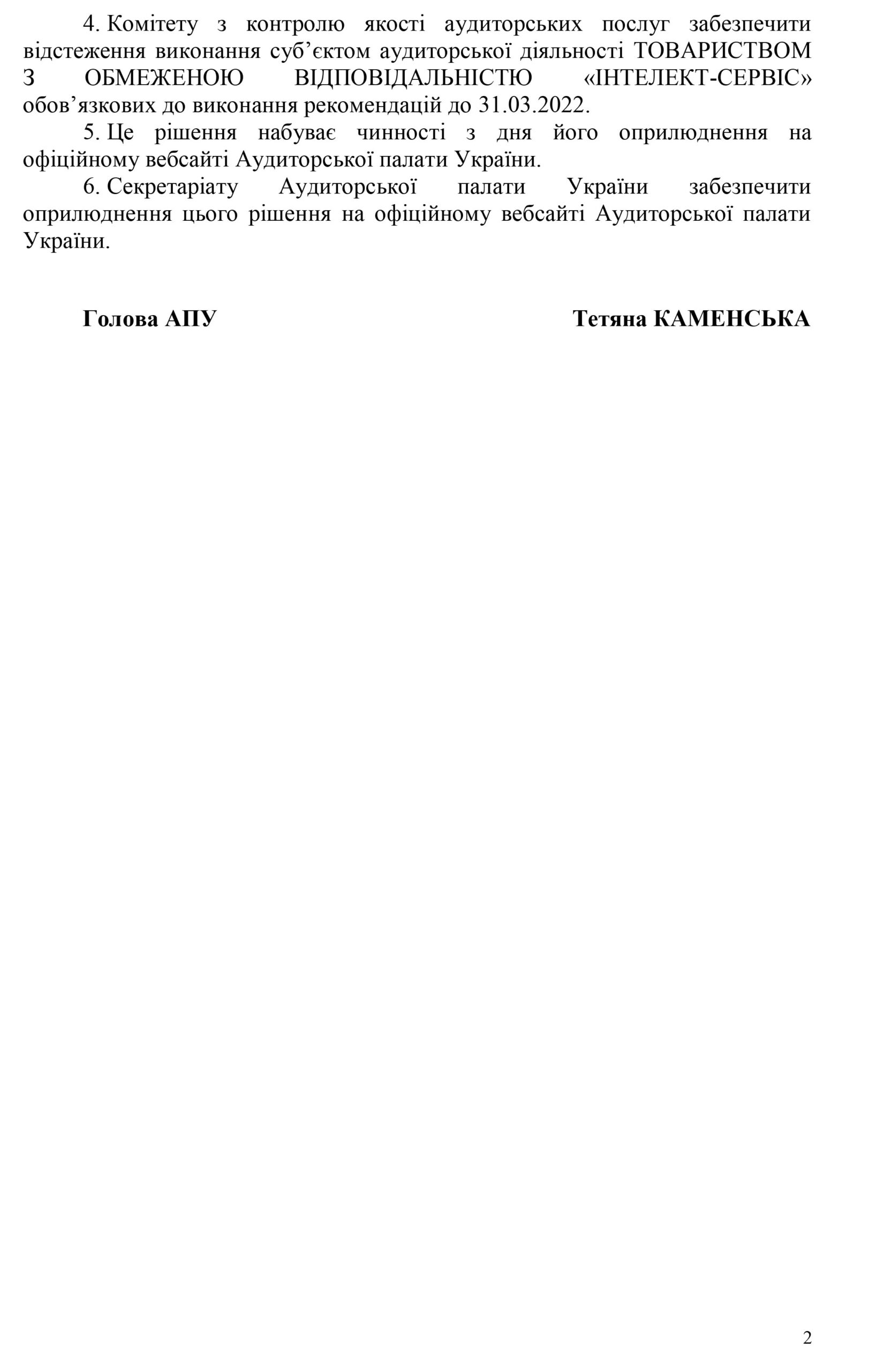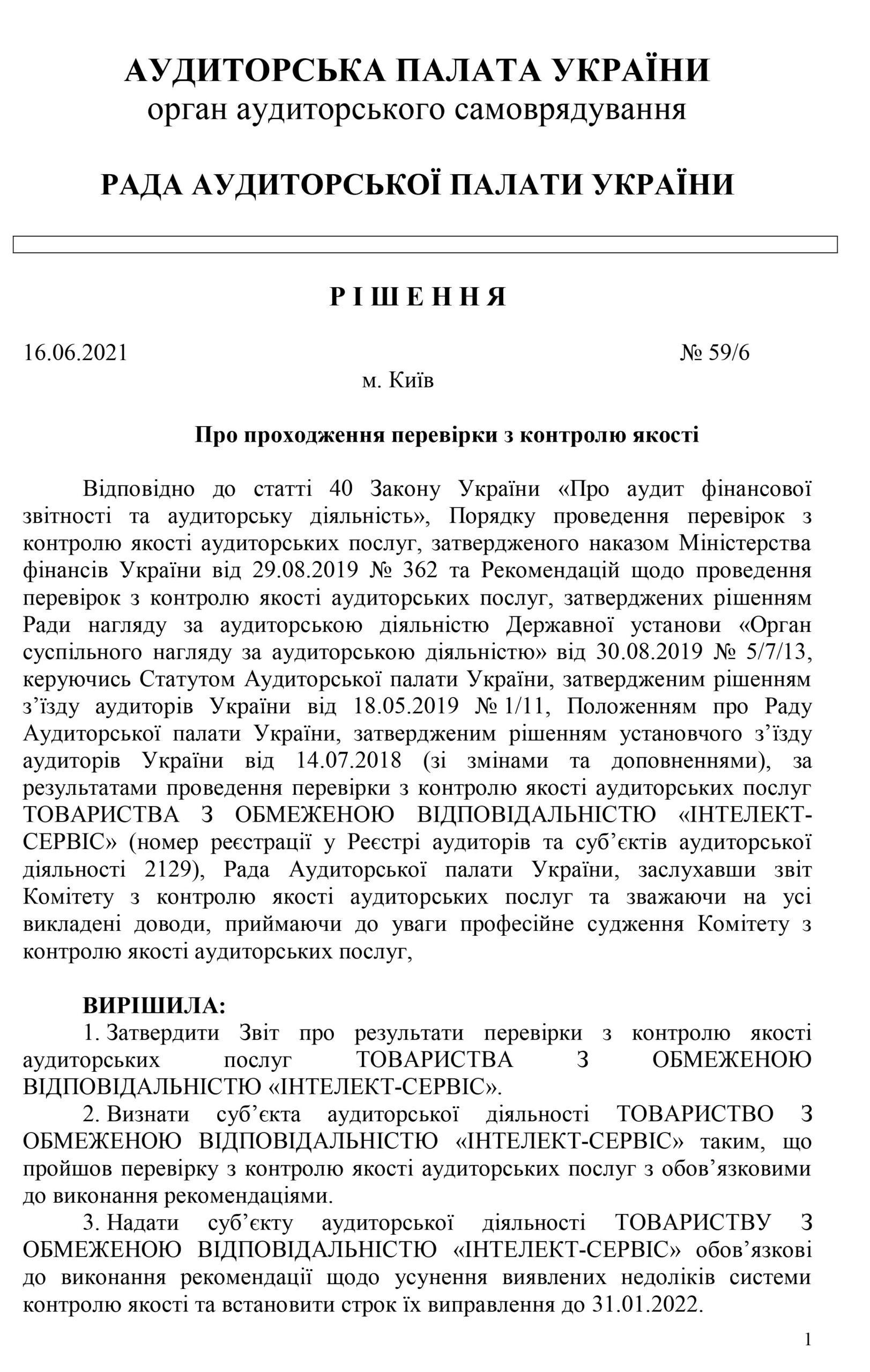 Якість аудиторських послуг, що надає ТОВ «ІНТЕЛЕКТ- СЕРВІС», а саме відповідність впровадженої на фірмі системи контролю якості вимогам Міжнародних стандартів аудиту та успішне проходження зовнішньої перевірки системи контролю якості аудиторських послуг, що підтверджено Рішенням Аудиторської палати № 59/6 від 16.06.2021.